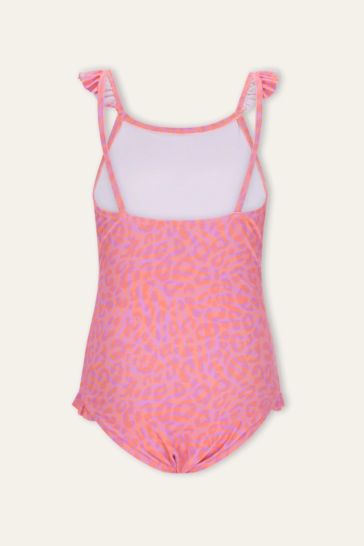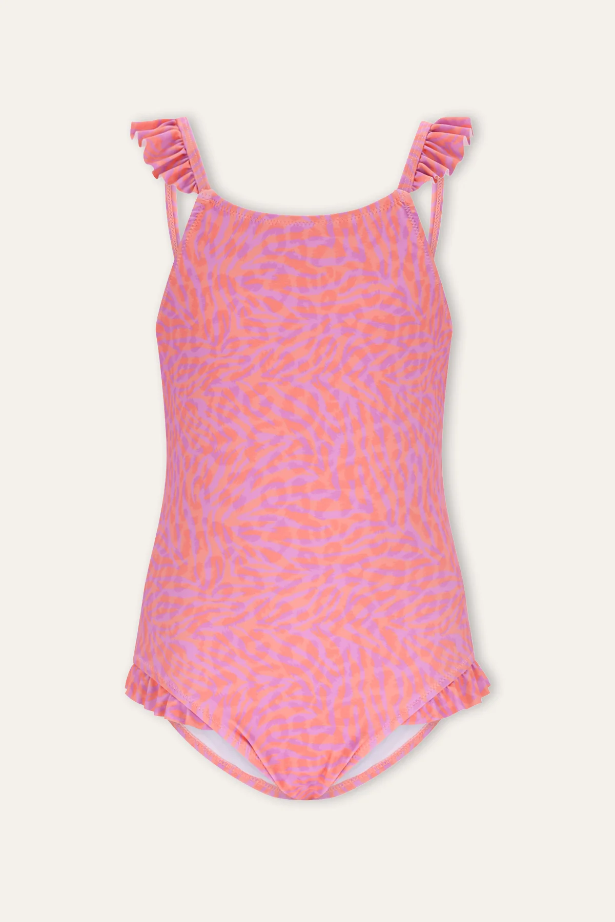 Dit vrolijke badpak maakt elke zwempartij een feestje! Gemaakt van elastische materialen, zit het heerlijk en laat jouw meid stralen. Perfect voor zonnige dagen en leuke uitjes naar het zwembad of strand. De schattige ruffles geven een speelse touch aan het ontwerp en de unieke oranje paarse zebraprint maakt het badpak extra bijzonder!