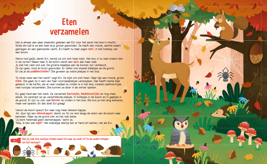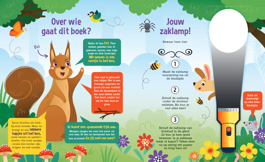 Eekhoorn Evi mag voor het eerst met haar broertjes en zusje in het bos spelen. Wat is er veel te ontdekken! Ieder seizoen ziet het bos er anders uit. Ga jij met Evi mee op avontuur? Het boek begint met leuke weetjes en feitjes over het bos. Hier kom je ook de kartonnen zaklamp tegen.
