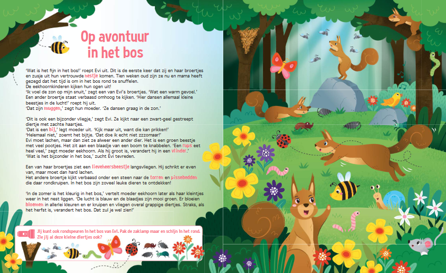 Met de zaklamp kan er samen gezocht worden naar de afgebeelde dikgedrukte woorden. Zo lees je samen interactief een boek. Er zijn meerdere thema’s te verkrijgen in deze serie!